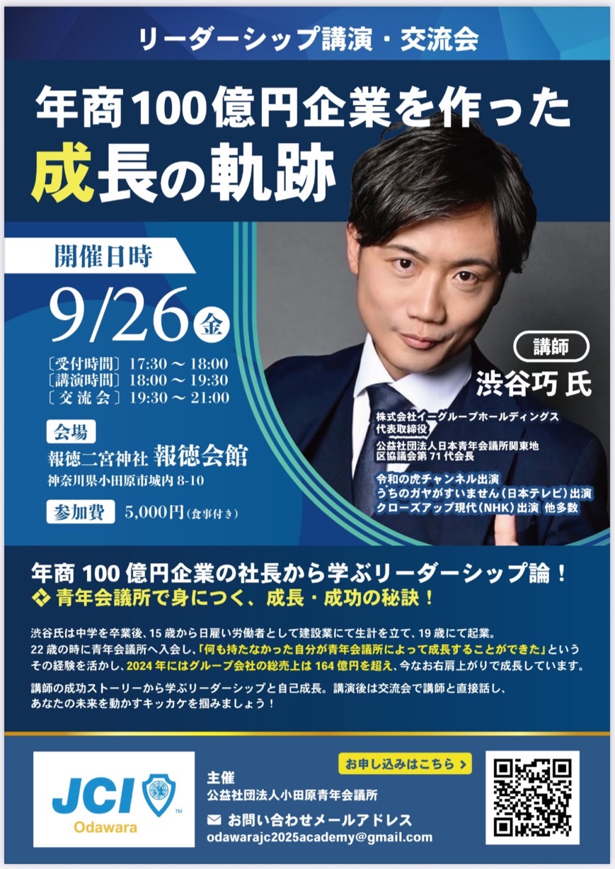 講師である渋谷巧氏は、中学校を卒業後の15歳から日雇い労働者として生計を立て、19歳の時に起業されました。22歳の時に青年会議所に入会し、「何も持たなかった自分が青年会議所の学びを経て、成長することができた」というその経験を社業に活かし、2024年度にはグループ会社の総売上は164億円を超える躍進を続けています。この講演会では、渋谷氏の成長・成功秘話を参考に「リーダーシップ」と「自己成長」について学ぶ場として実施いたします。
