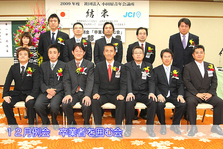 2009年12月1日(火) 12月例会 卒業者を囲む会 青年会議所は40歳で期間満了となり、これを卒業と呼んでいます。本年度は13名の方が卒業となりました。 この「卒業者を囲む会」が12月例会として開催され、卒業される方の長年の苦労をねぎらいました。